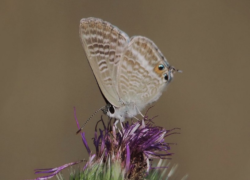 Apparence : mâle et femelle portent une queue sur chacune des ailes postérieures. Le dessus des ailes est bleu violet pour le mâle, brun avec la présence plus ou moins marquée de bleu pour les femelles, et avec deux points noirs à la base de chaque queue. Le dessous des ailes est marbré de brun clair avec de nombreuses fines lignes plus claires, et une bande blanche marquée sur l'aile postérieure. Les ailes postérieures présentent, deux ocelles bien visibles.