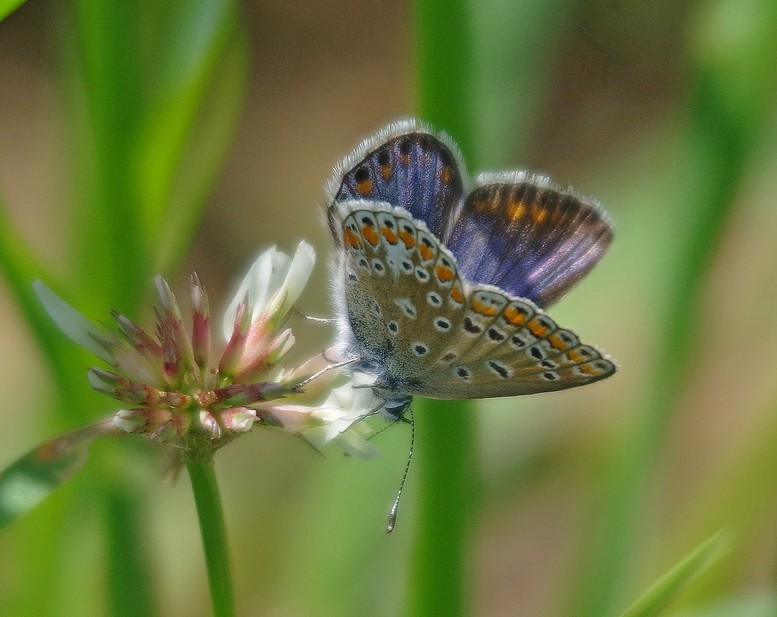 L'imago de Lysandrabellargus est un petit papillon qui présente un dimorphisme sexuel : le dessus du mâle est bleu ciel intense, celui de la femelle est marron bordé de lunules orange. Les deux sexes ont leurs ailes bordées d'une frange blanche entrecoupée de noir caractéristique. Leur revers est gris ou ocre, orné de points noirs cerclés de blanc et d'une série de lunules submarginales orange.