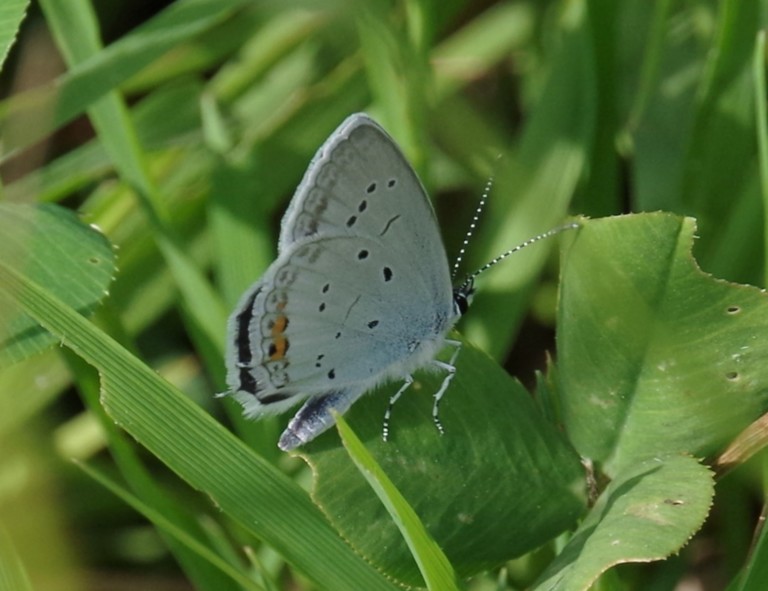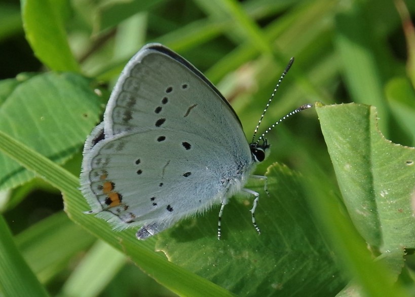 Le revers est gris pâle un peu suffusé de bleu et orné de lignes de petits points noirs cernés de blanc et à l'aile postérieure deux taches marginales orange.