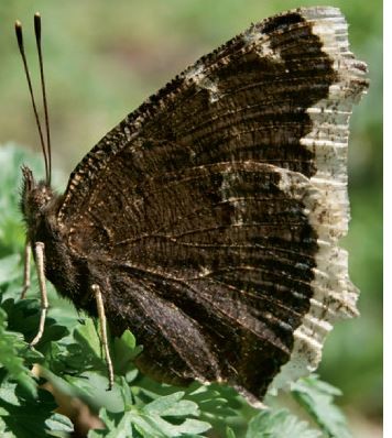 de ce très grand papillon est brun violacé, l'extrémité des ailes est bordé d'une large bande crème et une bande noire ponctuée de points bleus. Le dessous est plus terne et sans taches bleues. La femelle
