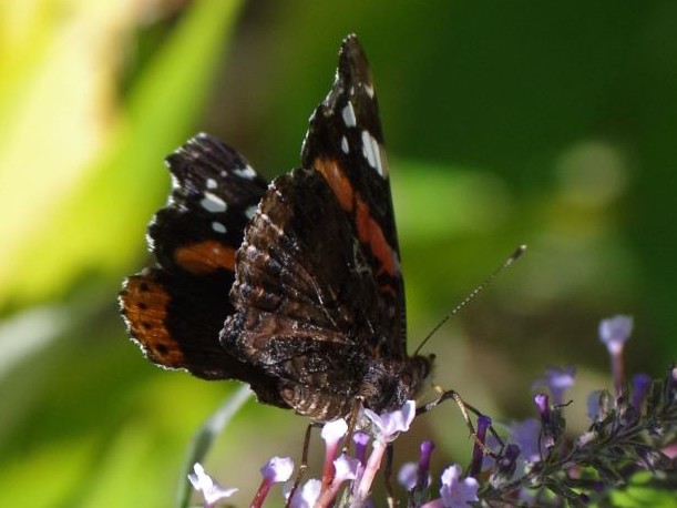 • Apparence : chez le mâle comme chez la femelle, le fond du dessus des ailes est noir, coupé sur l'aile antérieure par une bande rouge et marqué au bout par des taches blanches. Sur l'aile postérieure, une bande rouge marquée de points noirs borde l'aile. Sur le dessous, les ailes antérieures portent, en plus terne, les mêmes marques que sur le recto. Le dessous des ailes postérieures est par contre marron marbré, assurant un bon camouflage.