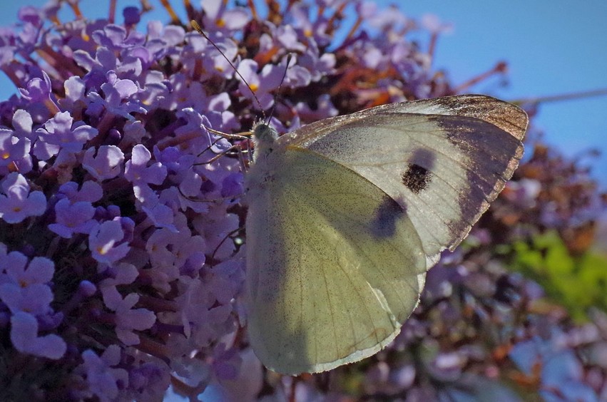 Plus connu comme le "papillon blanc du chou", Pieris brassicae relève de la famille des Pieridae, laquelle est représentée en France par une quinzaine d'espèces. Ce papillon est relativement grand (jusqu'à 65 mm d'envergure), et il est très largement répandu, d'autant qu'il est susceptible de migrer. Il peut se rencontrer quasiment partout, y compris en milieu urbain, et d'autre part il est connu pour atteindre une altitude de1800 m, voire 2000. Par-delà l'hexagone il occupe une grande partie de l'Afrique du Nord, et de l'Europe occidentale jusqu' au 62e degré de latitude nord. Bien entendu il se raréfie progressivement vers les régions les plus septentrionales de son aire de répartition. C'est par ailleurs un butineur, et comme la plupart des papillons dits "de jour" (= rhopalocères), son activité est à la fois tributaire de la température et de l'ensoleillement.Sous nos climats l'espèce a le plus souvent 2 générations (= bivoltine), mais une 3e peut s'observer dans le midi de la France. La génération dite vernale apparaît en avril-mai, l'estivale en juillet-août, et la dernière à l'automne. Les chenilles sont censées se développer sur les Crucifères "sauvages" comme la moutarde des champs (Sinapis arvensis), ou encore les ravenelles ( Raphanus raphinistrum), mais le chou est devenu la principale plante nourricière de l'espèce, avec une relative préférence pour le chou pomme, le fleur, le rave, et le frisé. A noter que cette Piéride peut à l'occasion se développer sur les capucines (Tropaeolum).
